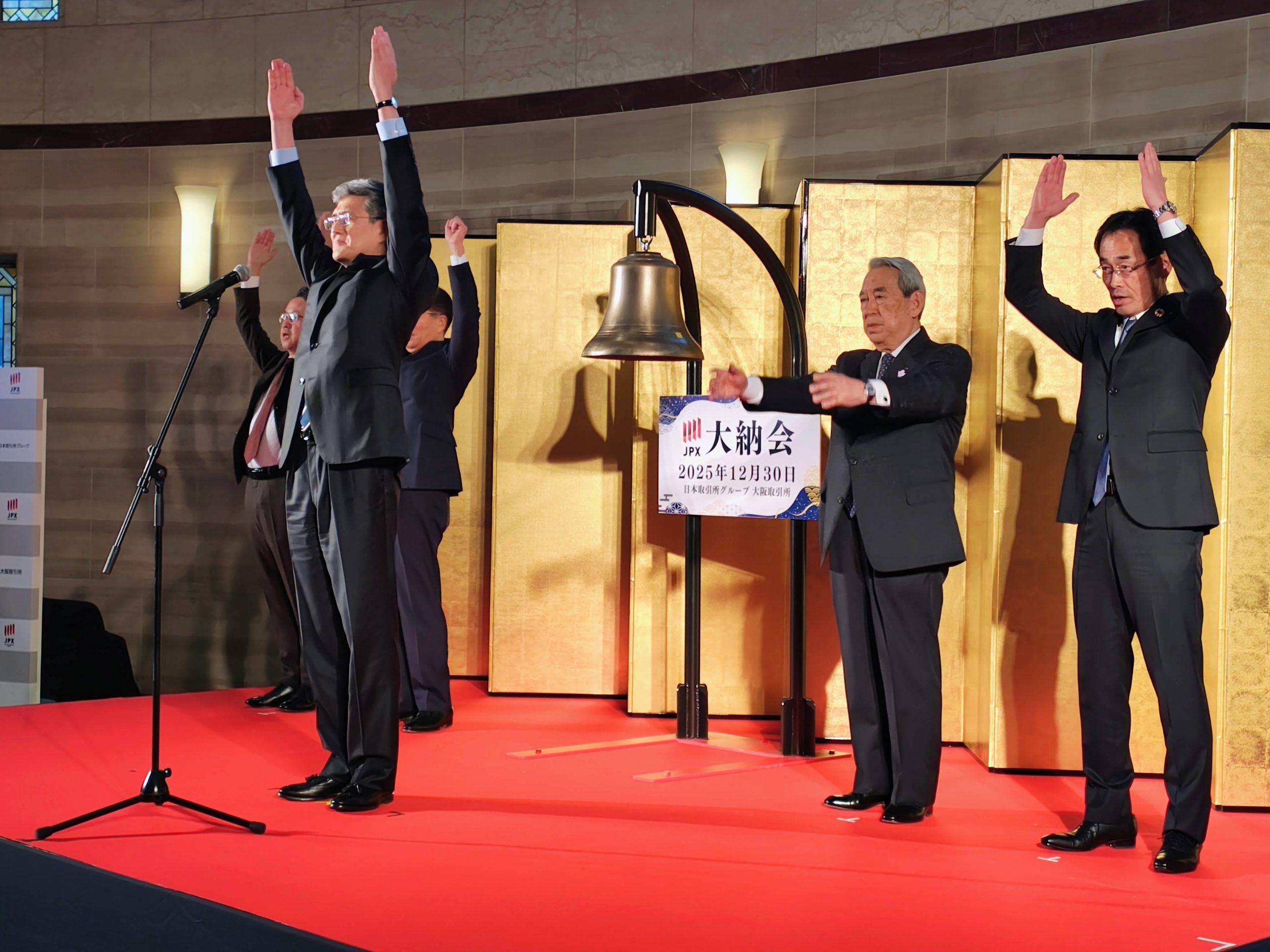 2025年の大納会が12月30日の大引け後に大阪取引所ビル1階アトリウムで開催された。この日の日経平均は続落し、日経平均は前日比187円44銭安の5万339円48銭で引けたものの、前年末の大納会での引け値3万9894円54銭からは1万円以上も大幅に上昇して引け5万円台という歴史的な最高値で引けた。