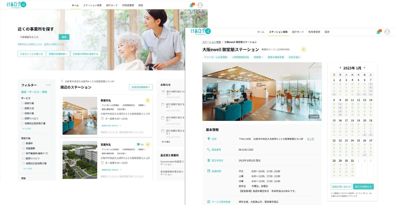 「けあログっと」は、全国の各地域にある訪問看護ステーションの特徴や空き状況をリアルタイムで表示し、患者に適したステーションをその場で見つけて依頼できるというこれまでには無かった新たな入退院支援サービス。